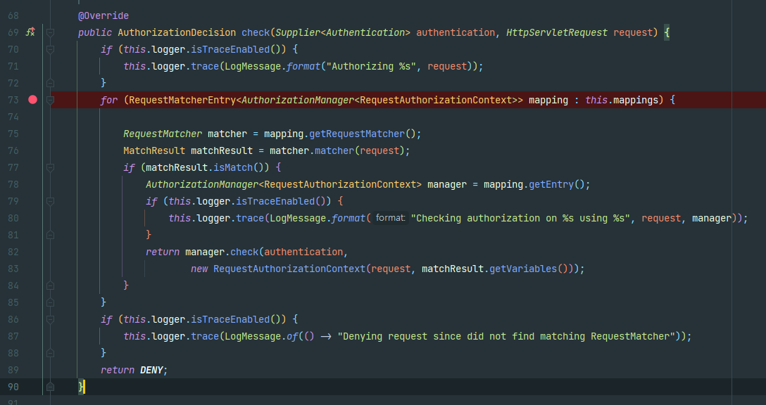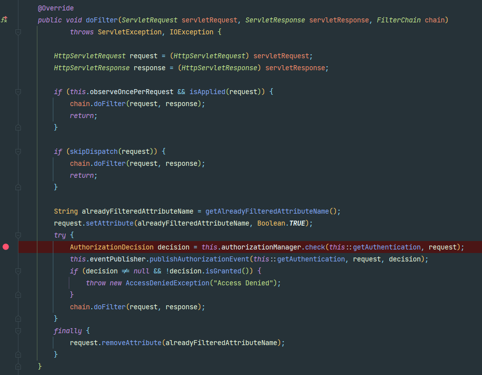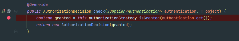 제가 브레이크 포인트를 걸어둔 부분을 보면, this.authorizationManager.check()를 확인 가능합니다.