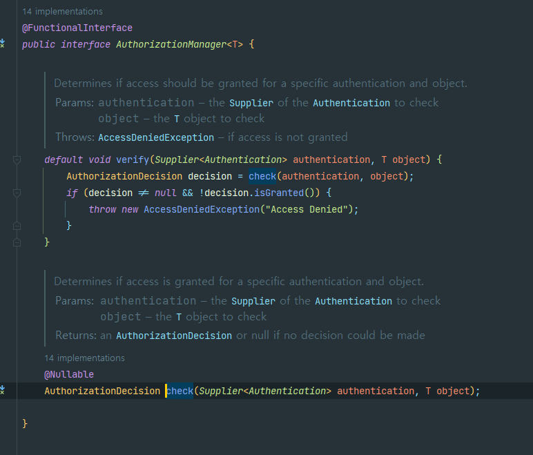 그리고 AuthorizationManager를 보면 인터페이스이며 check 매서드를 14개의 구현 클래스가 구현 한 것을 확인 가능하죠