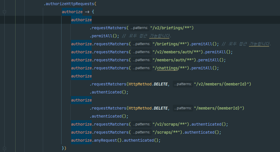 authorize.requestMatchers("/briefings/**").permitAll(); // 모두 접근 가능합니다.