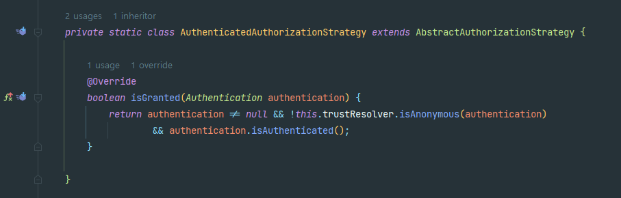 isGranted를 보면 authentication 객체가 null이 아니고, 익명 사용자가 아니고 동시에 isAuthenticated가 true인