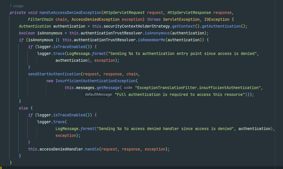 따라서 ExceptionTranslationFilter 를 직접 디버깅 하면서 어떻게 처리가 되는지 직접 살펴봤습니다.
