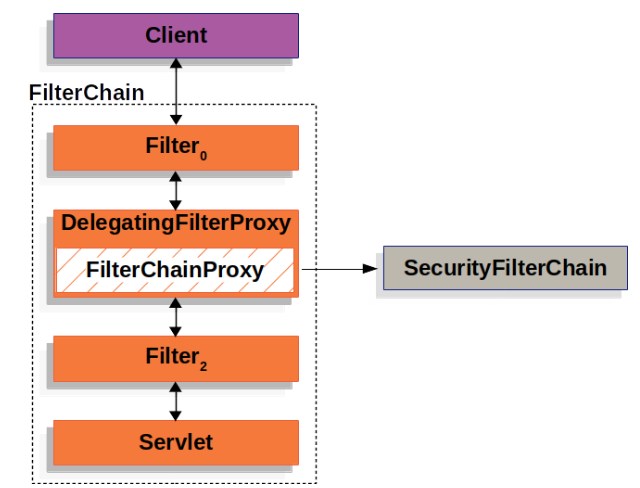 - 실제 인증, 인가 처리를 위한 필터들이 등록이 됩니다. 각각의 필터들은 _doFilter_를 통해 다음 필터를 호출하고 마지막 필터는 서블릿을 호출하게 됩니다. (보통 Spring MVC를 사용하기 때문에 디스패처 서블릿이 되겠죠?)