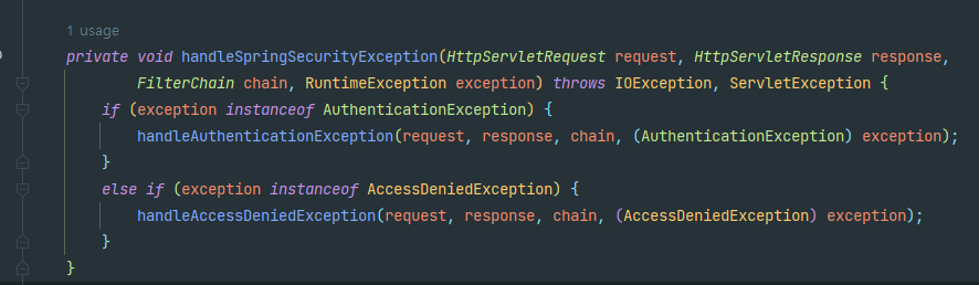 - 앞선 필터들을 통해 인증 처리를 진행, 그 과정에서 다음 필터로 넘어갈 필요도 없을 정도의 예외가 생긴다면 바로 throw를 해서 예외 처리를 진행