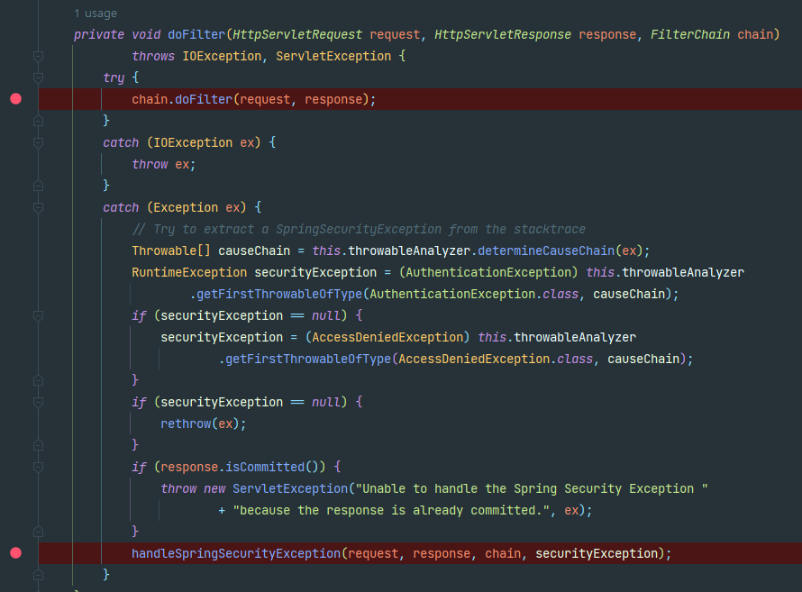 ExceptionTranslationFilter는 우선 try catch로 감싼 채로 doFilter를 통해 다음 필터를 호출합니다.
