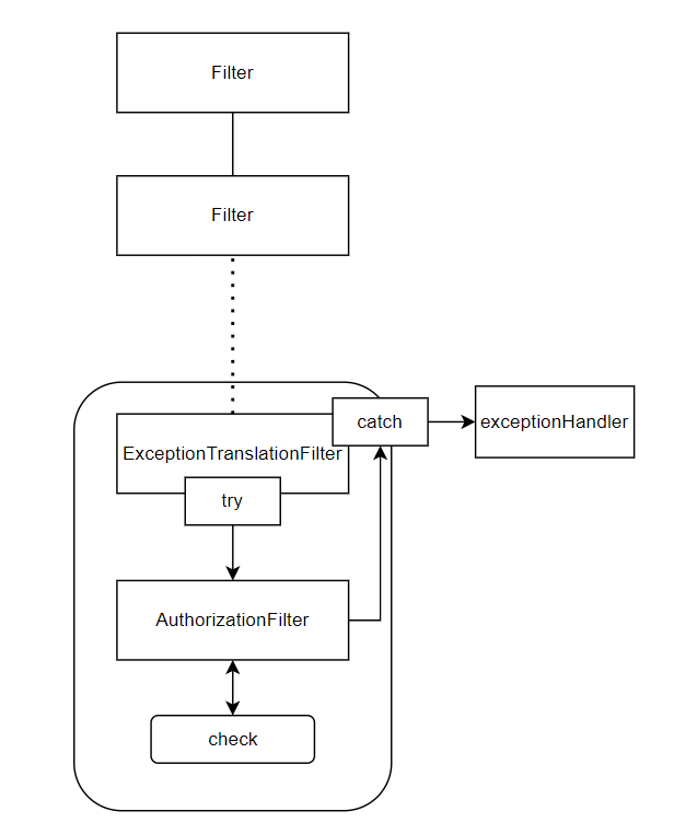 - 만약 exception이 throw 될 경우 ExceptionTranslationFilter가 catch를 한 후 등록 된 에러 핸들러를 통해 예외 처리