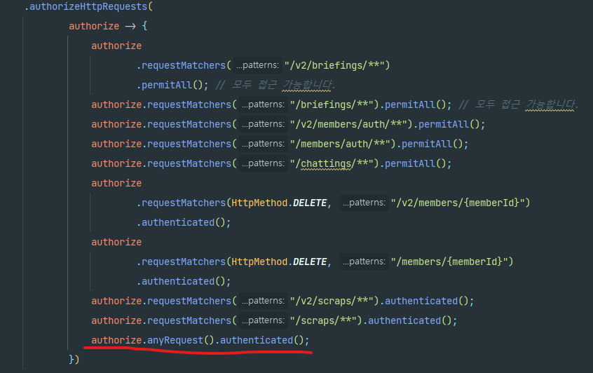 다시 한번 authorizeHttpRequests 설정 정보를 보면