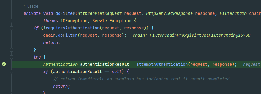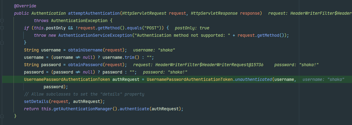 attemptAuthentication을 호출하게 되고 이를 통해 UsernamePasswordAuthenticationFilter에 도달합니다.