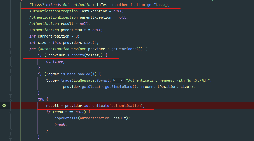 - ProviderManager는 내부적으로 가지고 있는 AuthenticationProvider의 목록 중에서 form Login에 대한 인증이 가능한 AuthenticationProvider를 찾는다. 이 경우 DaoAuthenticationProvider가 선택이 된다.